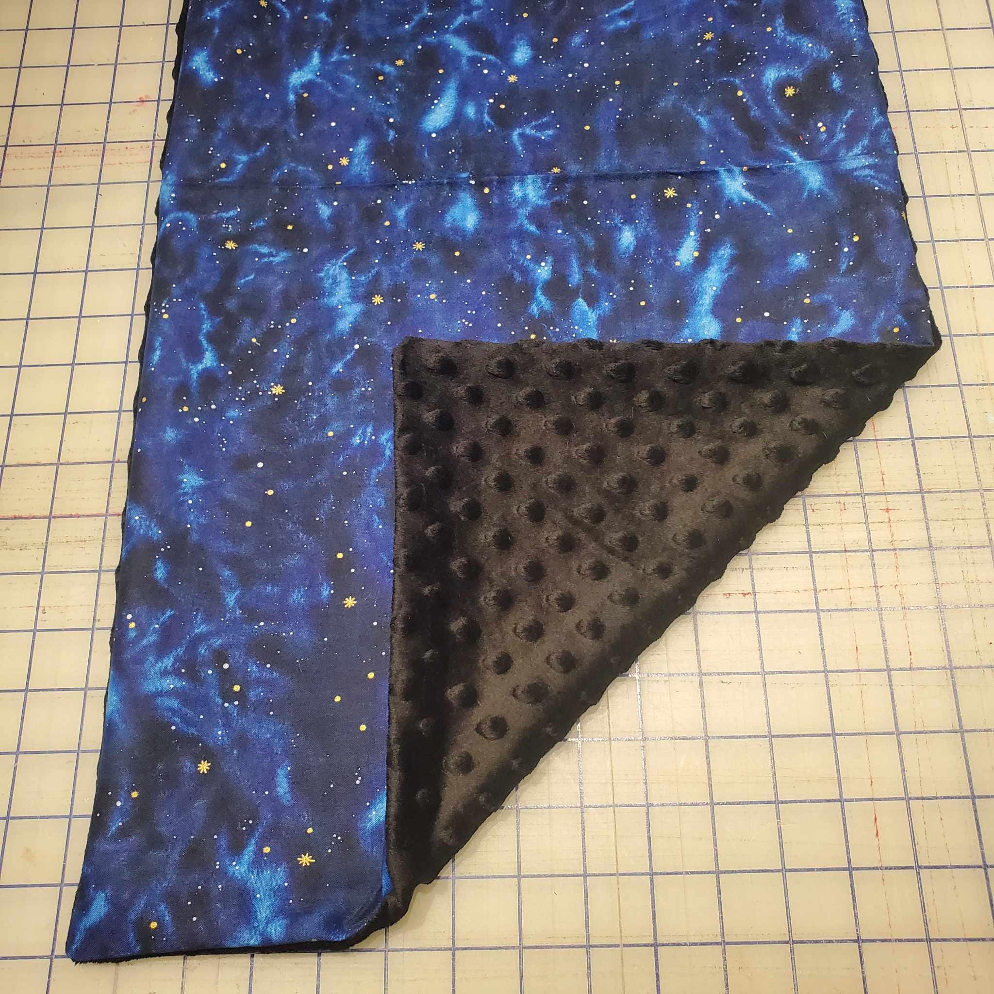 This listing is for a weighted lap pad to be made from the photo in this listing. Made in 3 pounds, from Galaxy Fabric and Black Minky Backing.