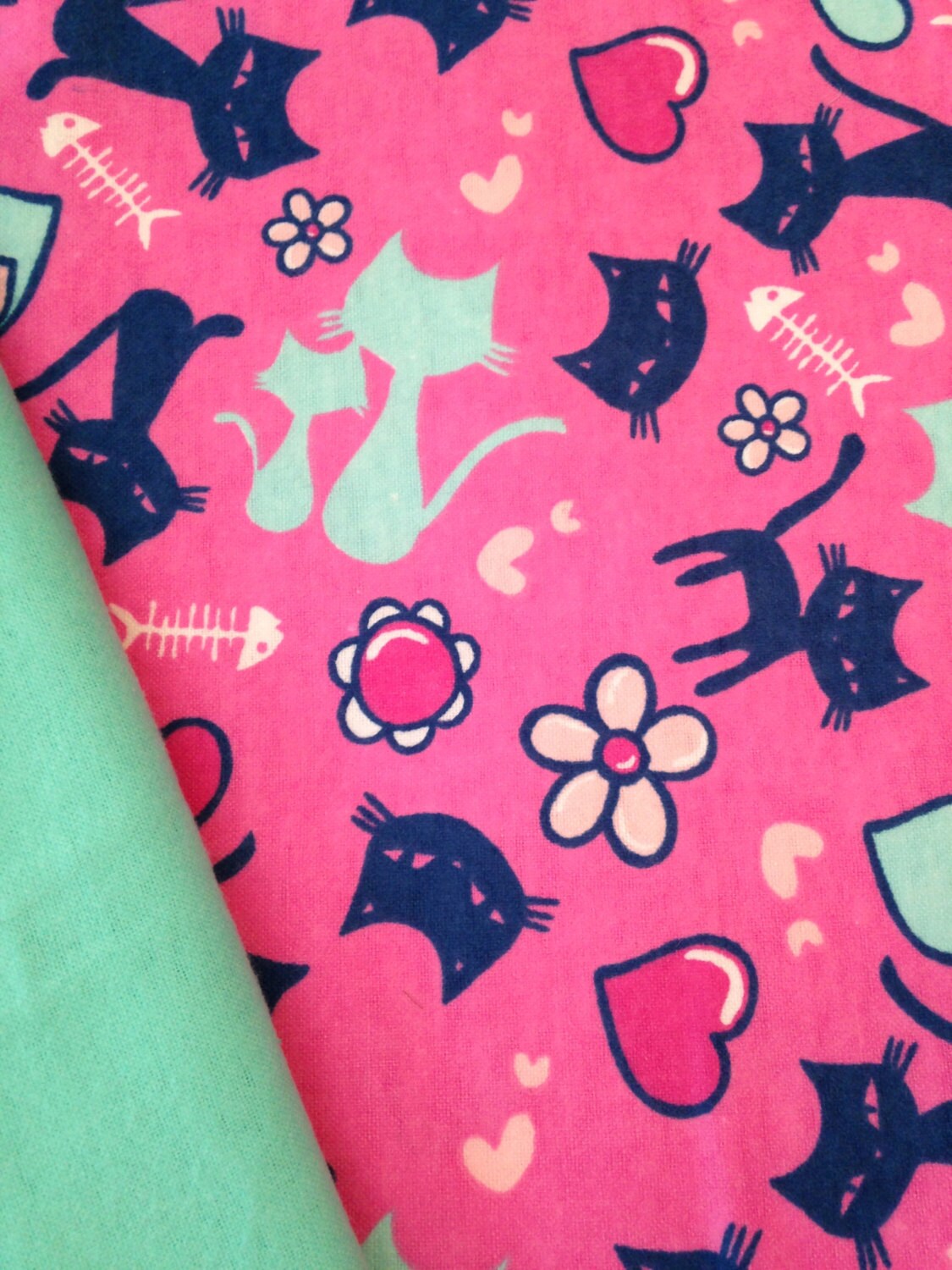 Kitty Cat themed fabric and backed with a coordinating aqua mint flannel fabric for added softness and texture.