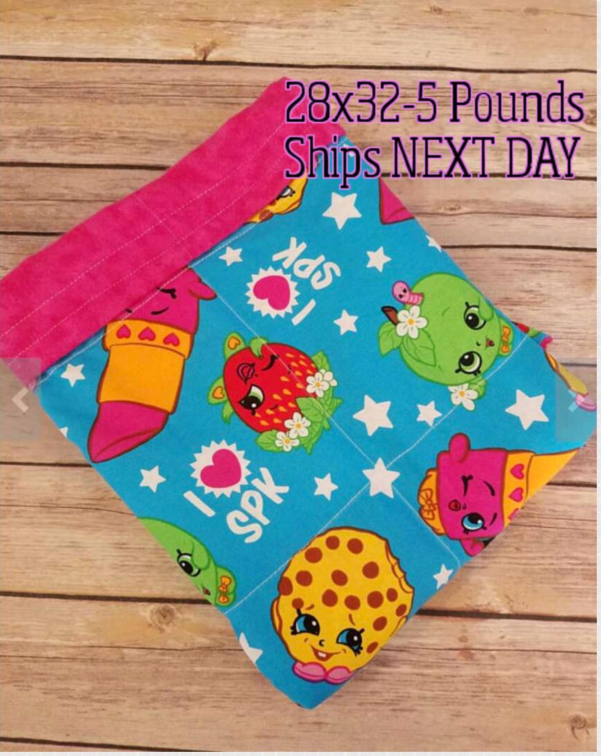 This is a sensory weighted blanket. The blanket comes in 5 pounds and measures 28x32 inches. This is a great size for a toddler or older child.