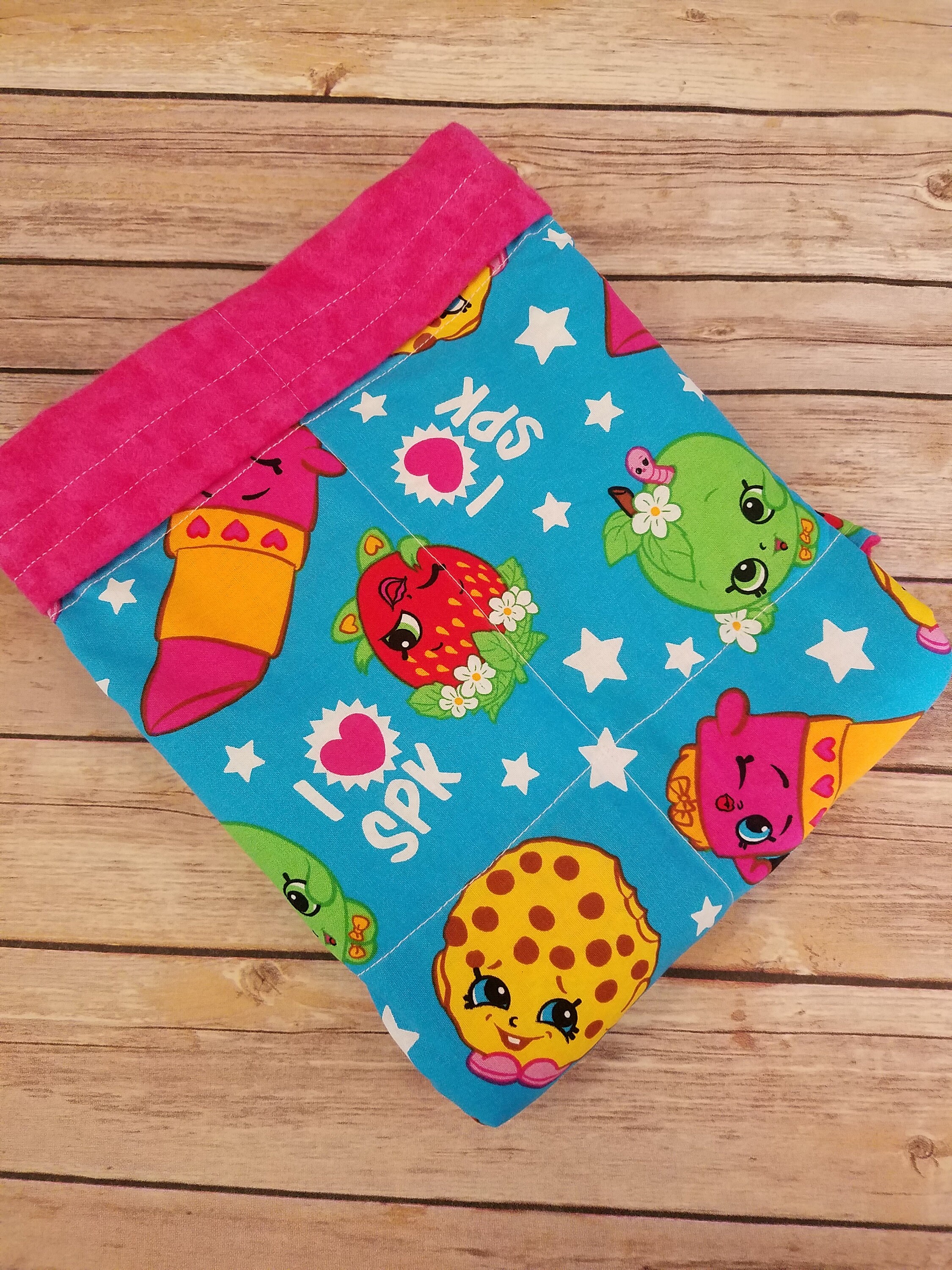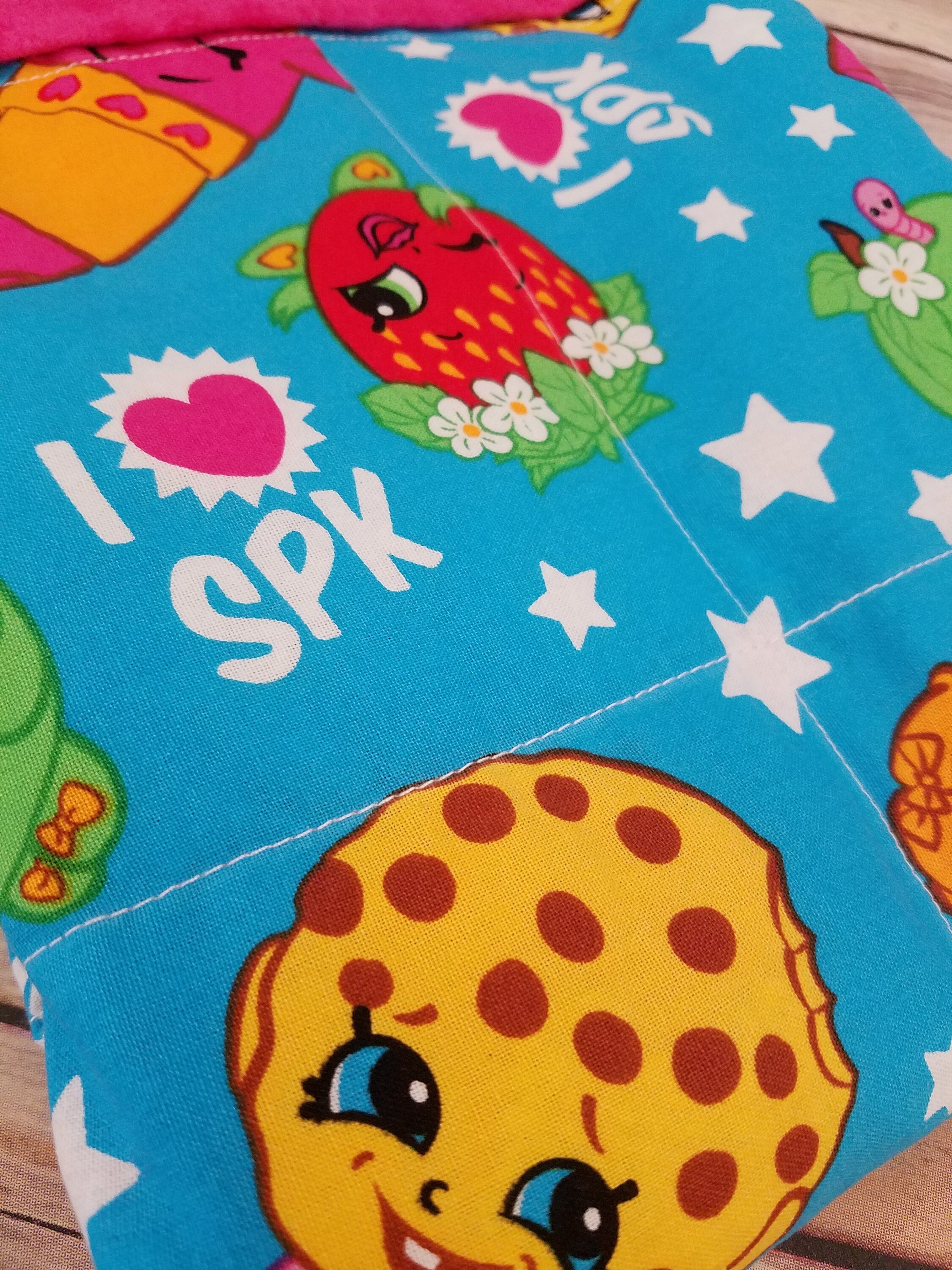 Made from woven cotton fabric and backed with a tie dye pink snuggle flannel fabric for added softness and texture.