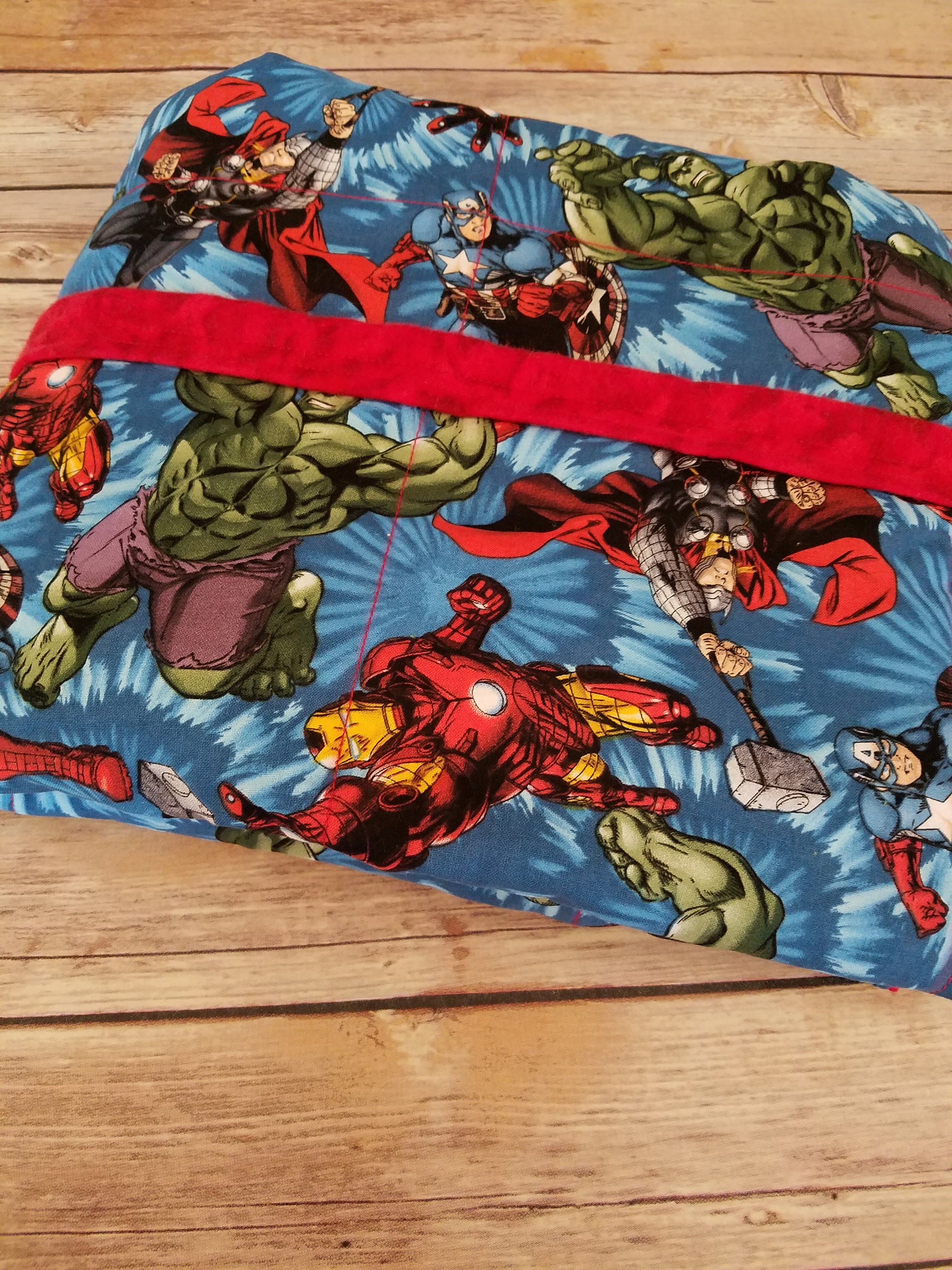 Made from Super Hero themed woven cotton fabric and backed with a coordinating red snuggle flannel fabric for added softness and texture.