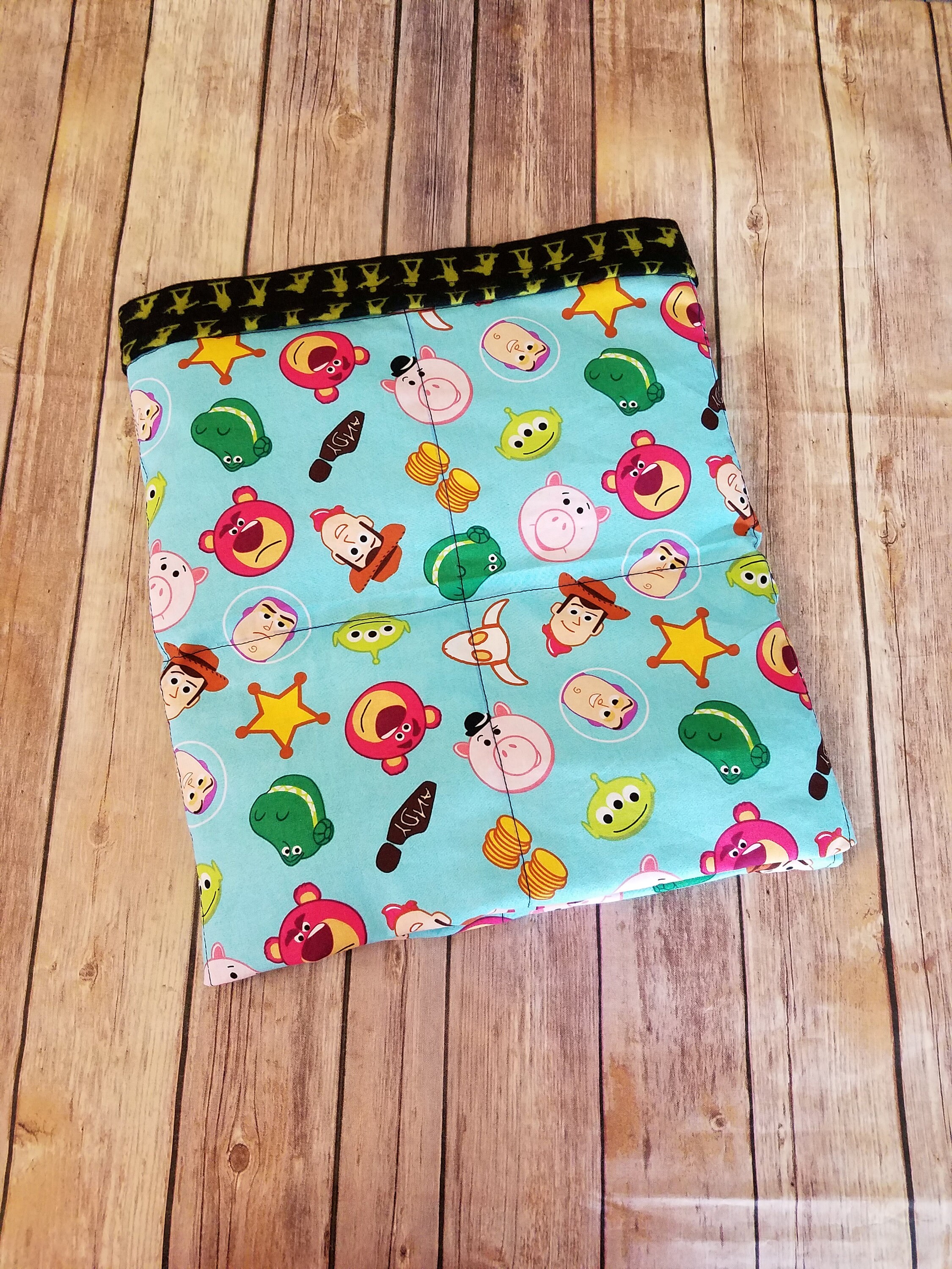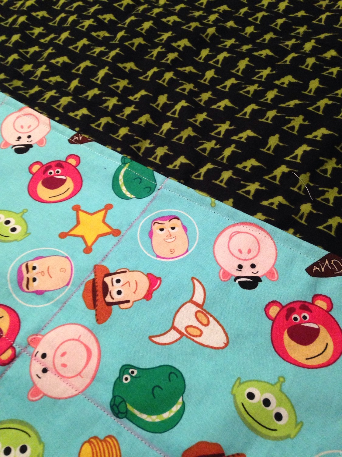 Cartoon themed woven cotton fabric and backed with a coordinating army men ultra cuddle flannel fabric for added softness and texture.