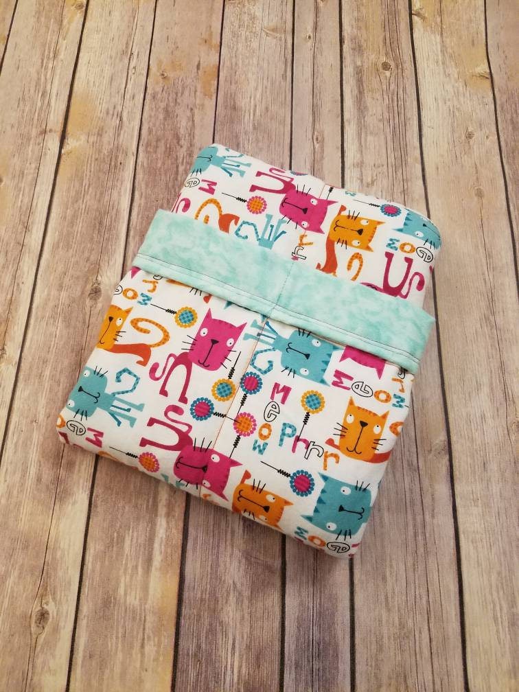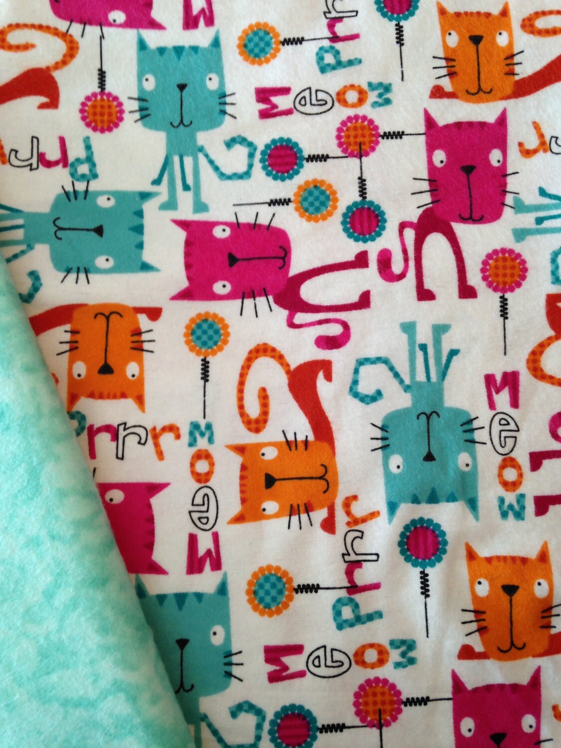 Made from Cat themed snuggle flannel fabric and backed with a light mint tie dye ultra cuddle flannel fabric for added softness and texture.