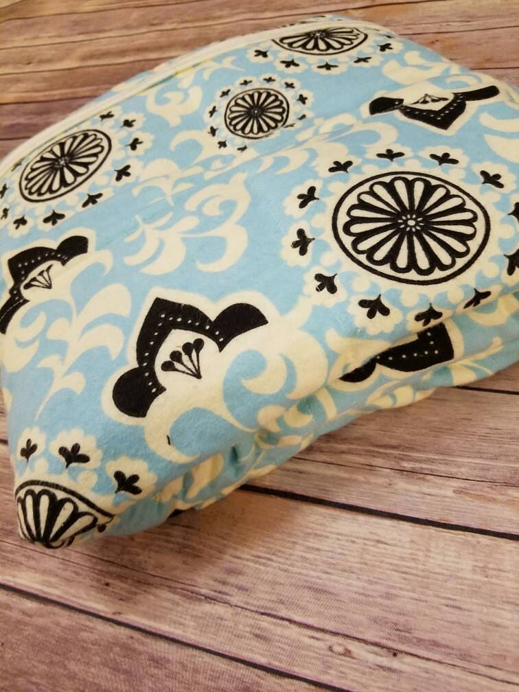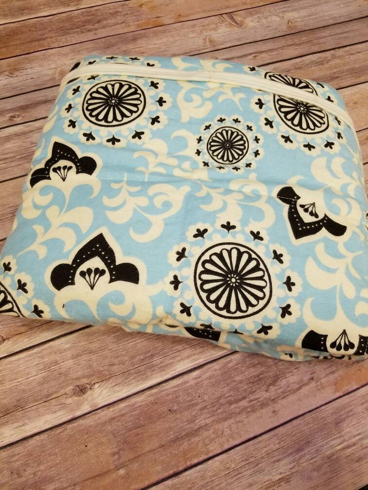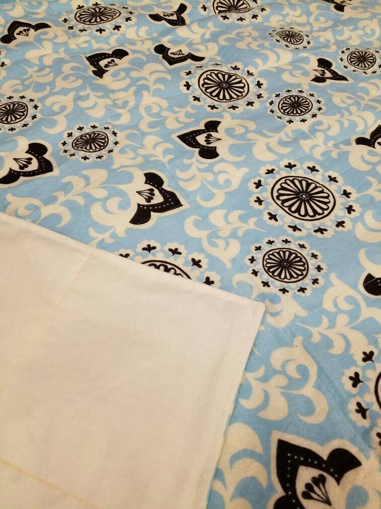 Weighted Blanket, 15 Pounds, Light Blue, Black, and Ivory Damask Pattern with an Ivory Backing. 40x60 in size. Twin Size. Ready to ship. Blanket in the picture is the blanket you will receive. This is made from Cotton Flannel Fabric.