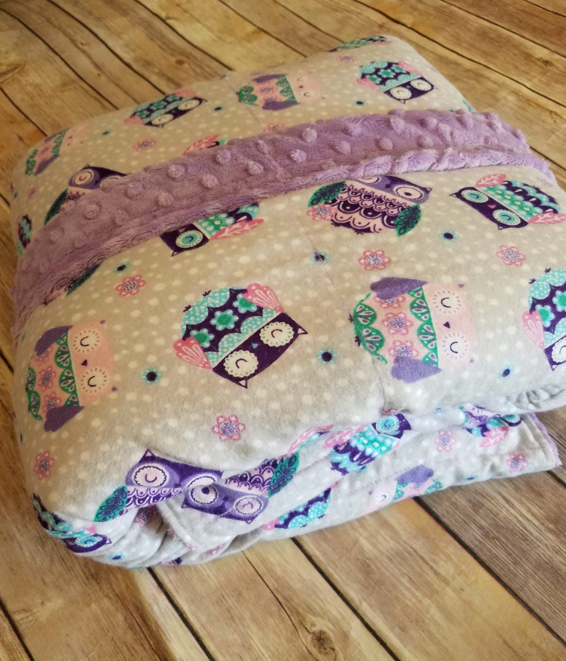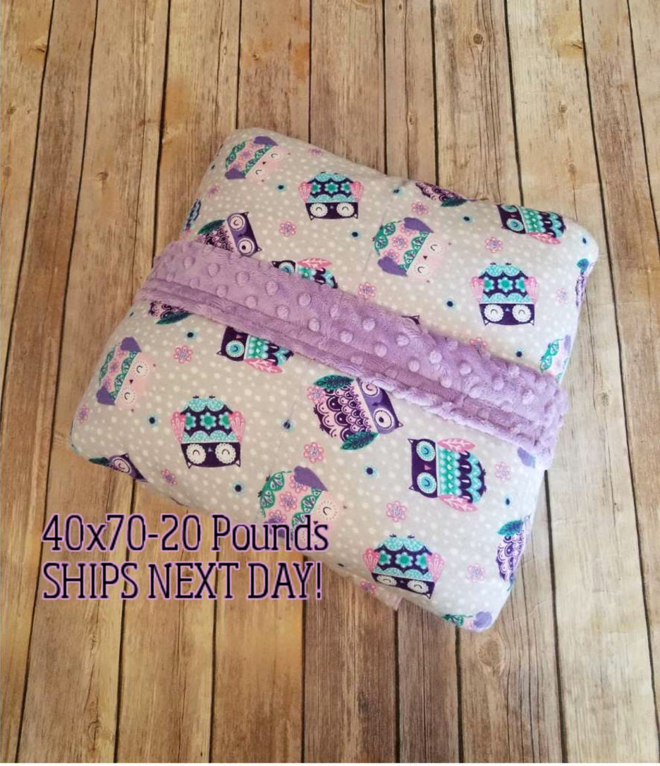 Minky Weighted Blanket, 20 Pounds, Owl Cotton Flannel Front with Lavender Minky Back, 40x70 in size. Twin Size. Ready to ship. Blanket in the picture is the blanket you will receive.
