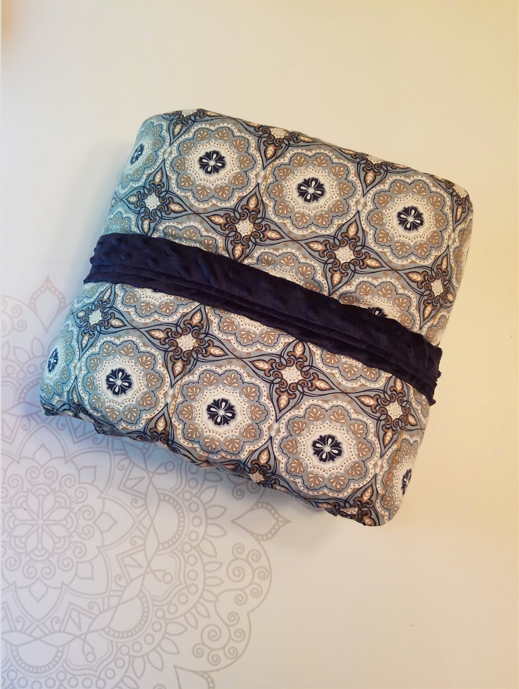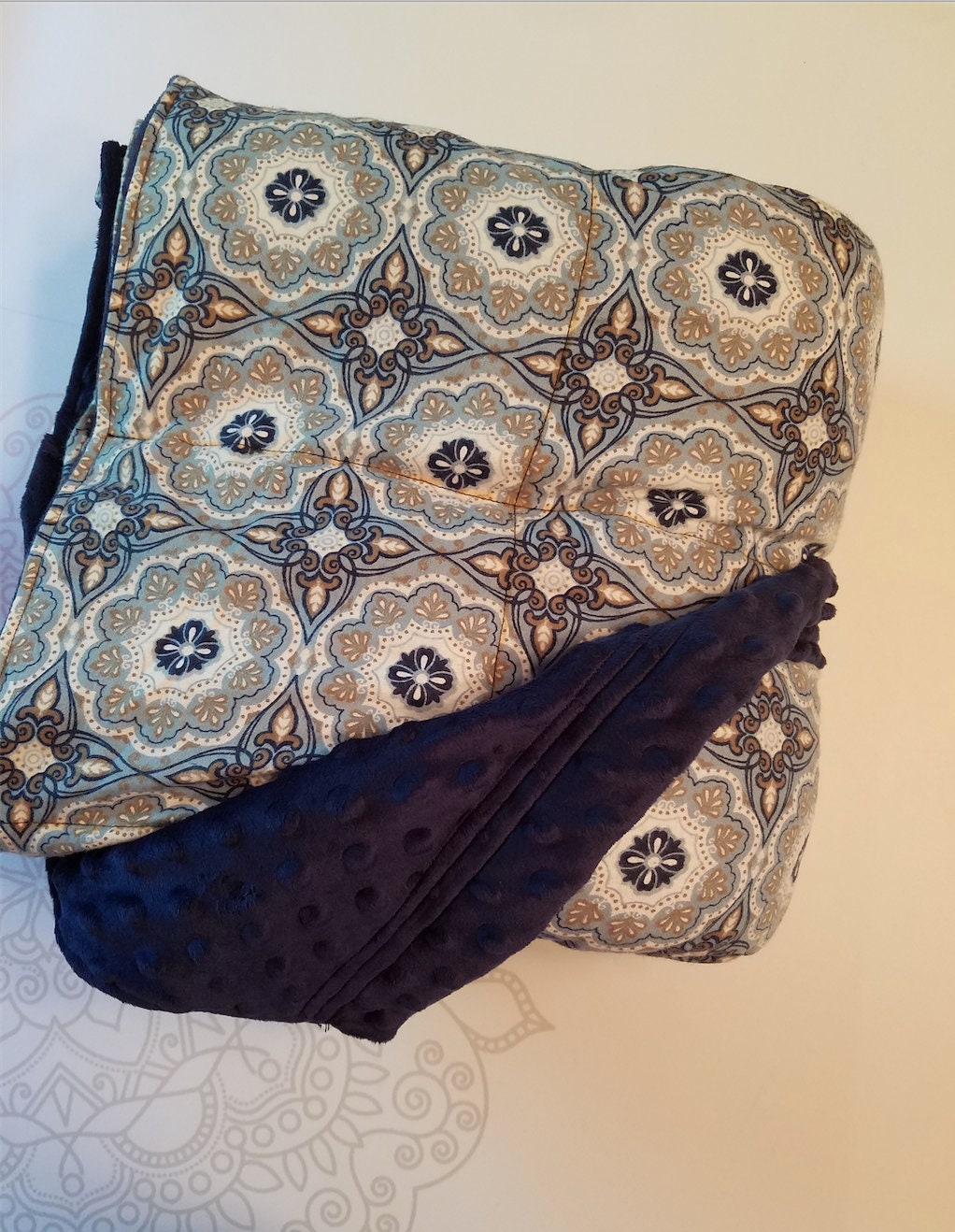 Weighted Blankets should be used as part of therapy. No one should EVER be forced to use a weight product, or wrapped/swaddled in one, nor should a weighted blanket be used over someones head and/or face area. Weighted Blankets should be made available to the individual and used as a tool for comfort as they feel the need. Do not use on infants under 3 months of age ever, or on infants under one year without consulting with your physician, persons with serious lung conditions or difficulty breathing, without consent and direction of a physician. Please consult your physician, clinician, or therapist with any questions about specific individual use. If poly-pellets should release from a Blanket due to damage, or long-term wear, they are not harmful, but can be a choking hazard, and care should be taken to make sure they are not ingested, as is the case with any non-edible item. NamasteHandMade manufactures products only and cannot give advice on Therapy. We will make each product to order based on your order & specifications. The formula we recommend is 10% of body weight + 1 lb, is the industry standard, and has been suggested by many therapists. We are not your licensed therapists. To ensure you have the correct weight for your needs, please contact your doctor, clinician or therapist. NamasteHandMade takes every precaution to ensure a quality product. Please inspect for defect or damage before use. If noted please discontinue use immediately. Products are completely encased and all exterior seams are double stitched for your safety. If you notice a tear, especially one exposing pellets, discontinue use until repair or replacement can be made. Do not ever place our products in the Microwave Oven as they could cause serious burns or a fire. Also heat such as the oven or direct heat from sources such as an iron will cause damage. If you would like to warm your blanket, we recommend placing it in the clothes dryer for 10-20 minutes as the ONLY way to warm it.