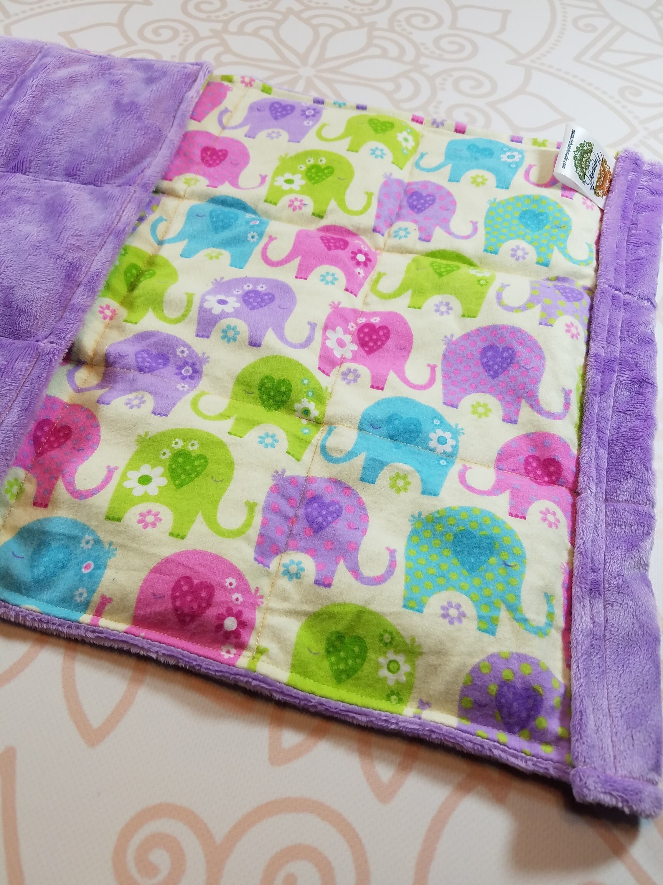 Made from pastel elephant cotton flannel fabric front and backed with a coordinating lilac smooth minky fabric for added softness and texture.