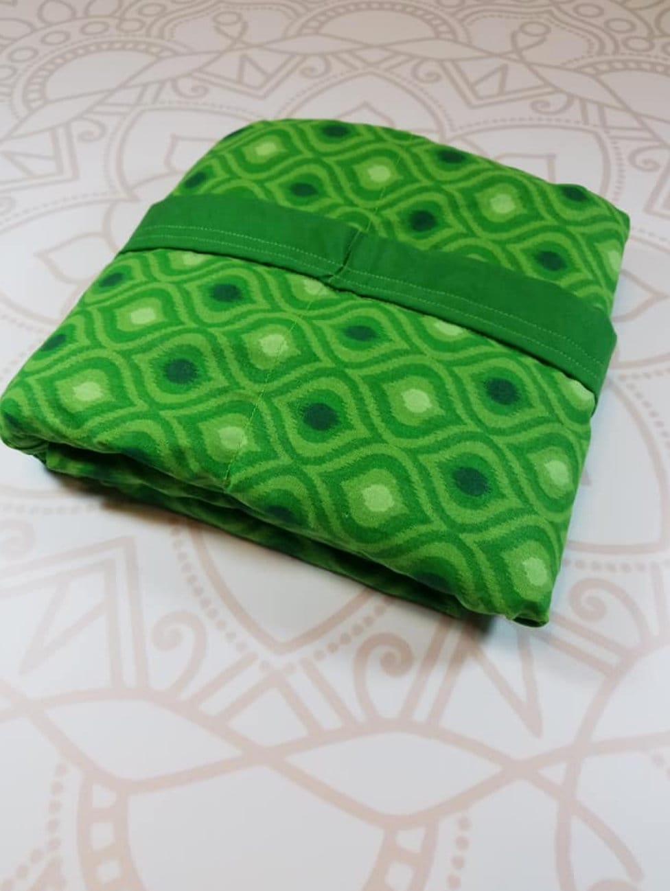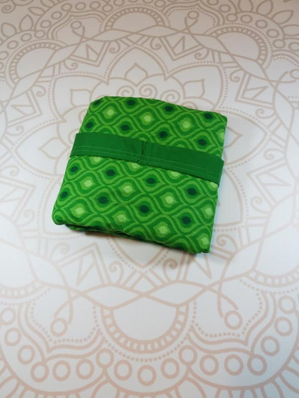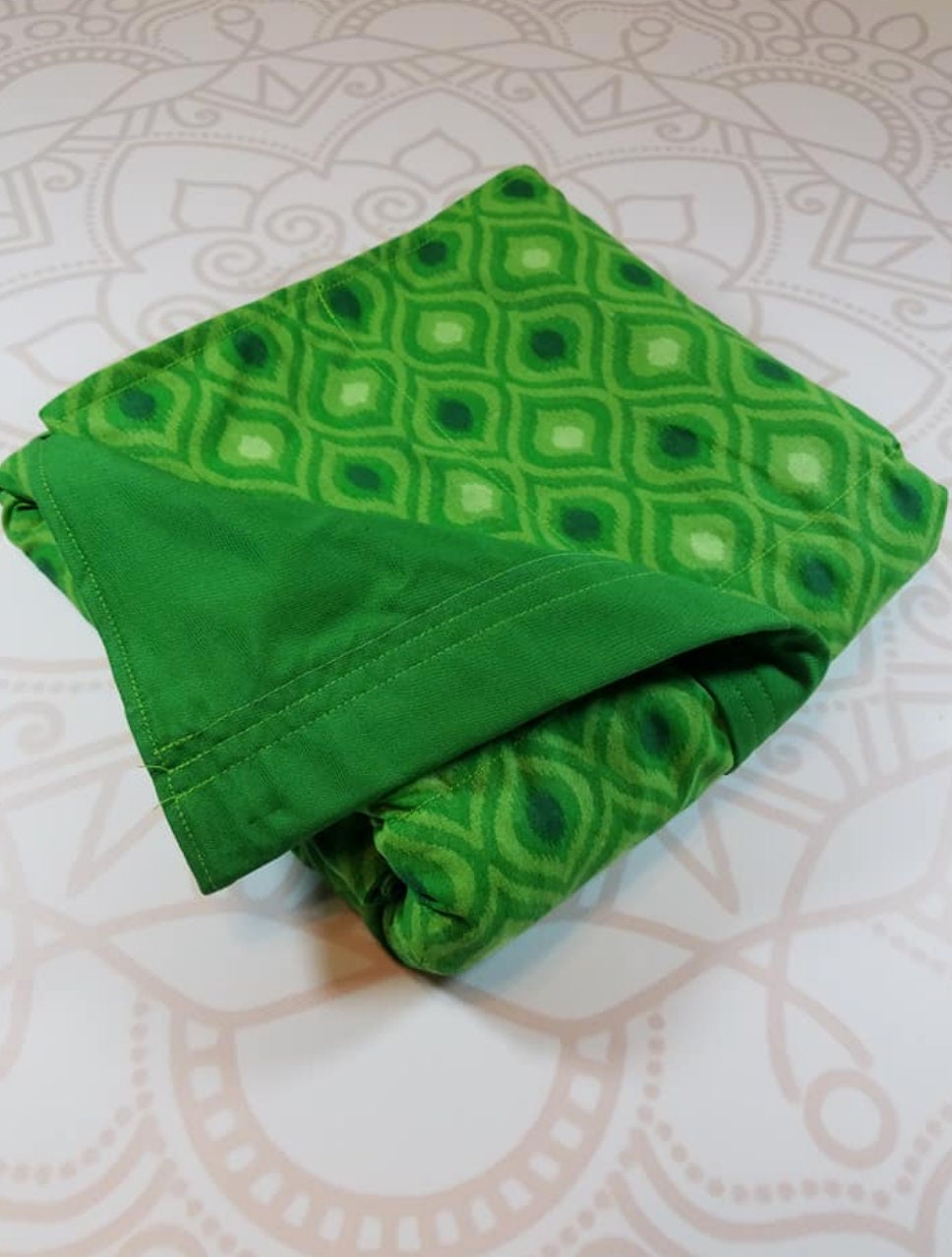 Made from green moroccan themed cotton fabric and backed with a purple green woven cotton fabric for added softness and texture.